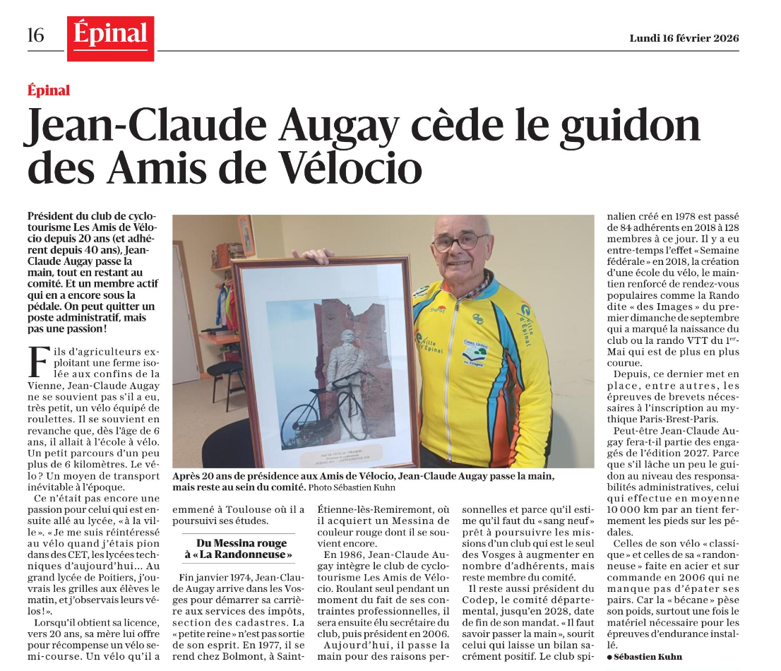 Jean Claude Augay a les honneurs de la presse pour son départ de la présidence des Amis de Vélocio EpinalArticle paru dans Vosges Matin du 15 février 2026